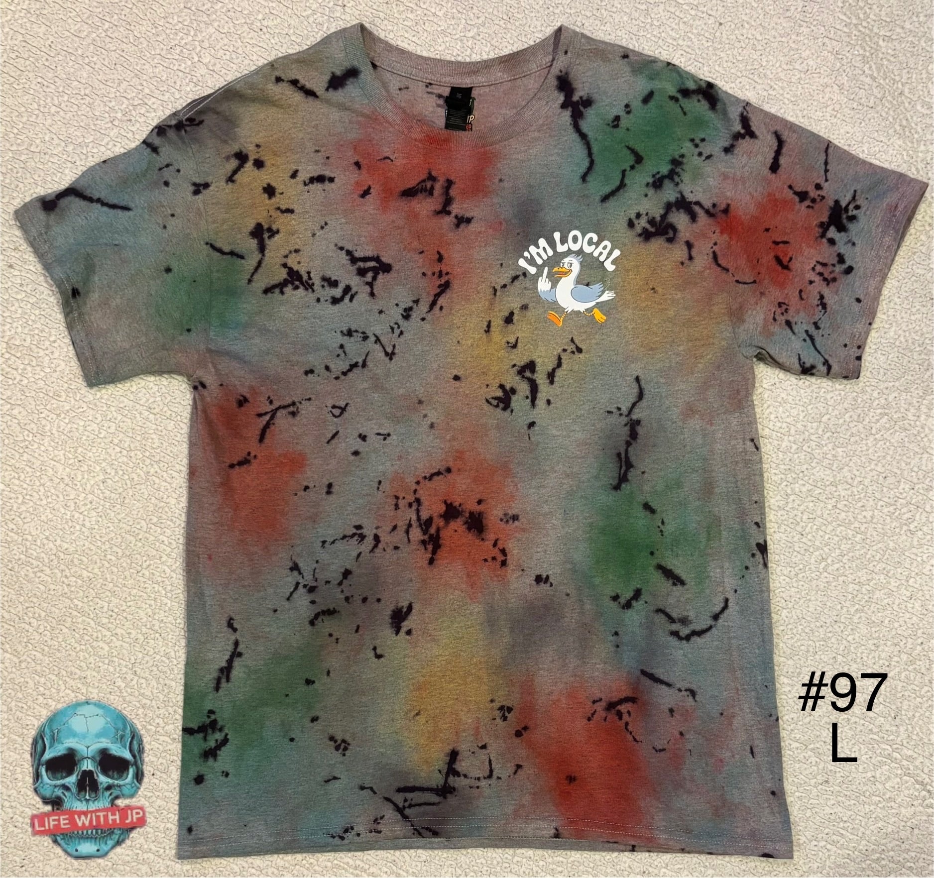 This LIFE WITH JP REMIXED "IM LOCAL" tee features a multi-color tie-dye base with splashes of red, green, gold, and gray, accented by dark black splatter marks for a gritty streetwear edge. On the chest, the playful “I’m Local” seagull graphic pops in white and yellow, giving the shirt a humorous coastal vibe while staying bold and unique.