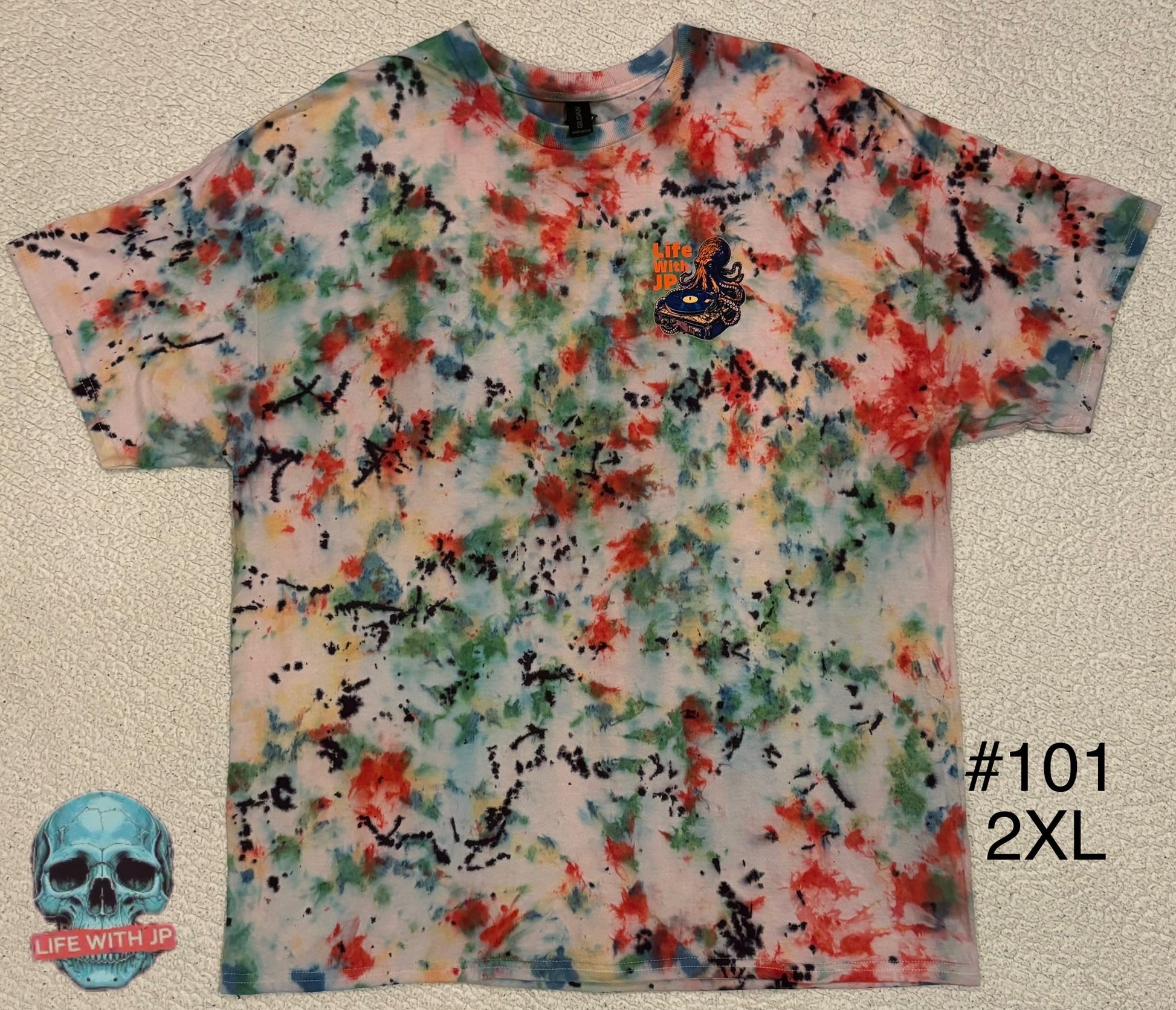 This vibrant LIFE WITH JP REMIXED OCTOPUS RECORD PLAYER (2XL)tee is a true statement piece, featuring an all-over splatter tie-dye design with bold hits of red, green, teal, and black against a soft pastel base. The chaotic pattern makes every shirt completely unique, radiating both energy and creativity. On the chest, the Life With JP octopus-and-turntable logo pops in bright orange and blue, tying the design back to the brand’s music-inspired roots.