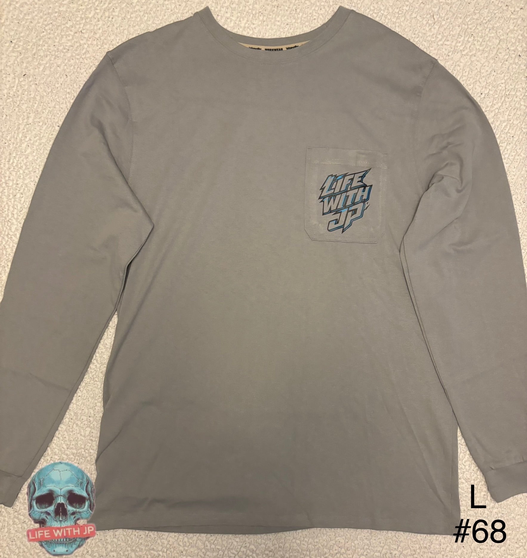 This REMIXED (LARGE) clean gray long-sleeve pocket tee keeps it simple but bold. On the front chest pocket, the Life With JP logo is printed in a sharp electric blue with black edging, giving it a modern, graffiti-inspired edge. The neutral gray base makes it versatile for everyday wear, while the long sleeves and pocket detail add both comfort and utility.
